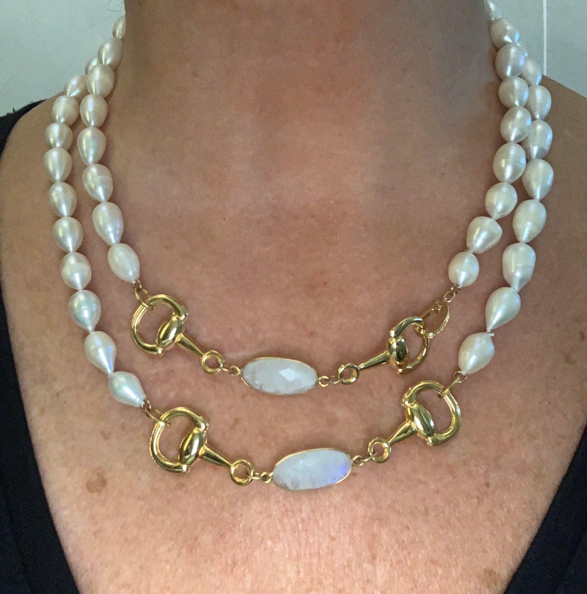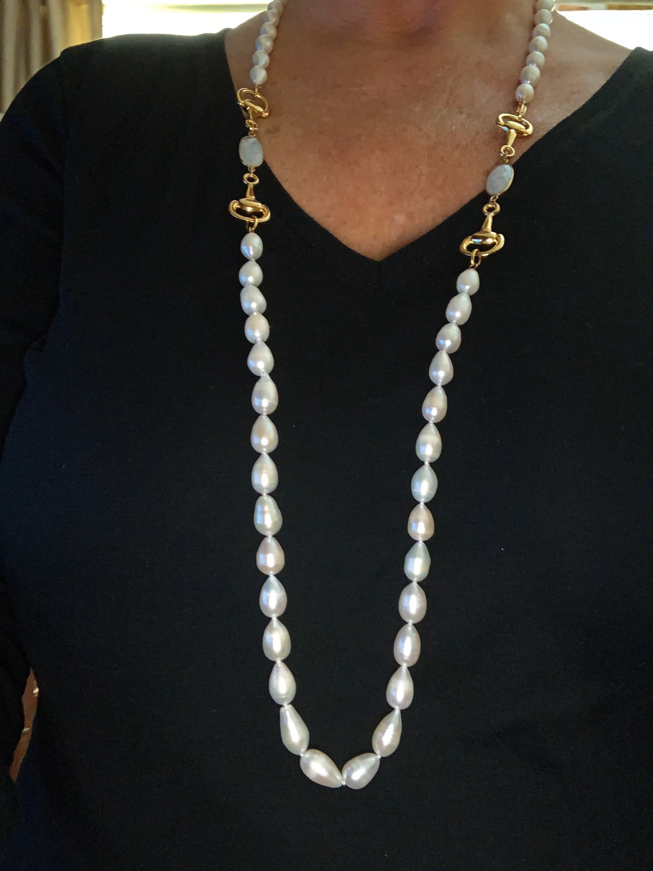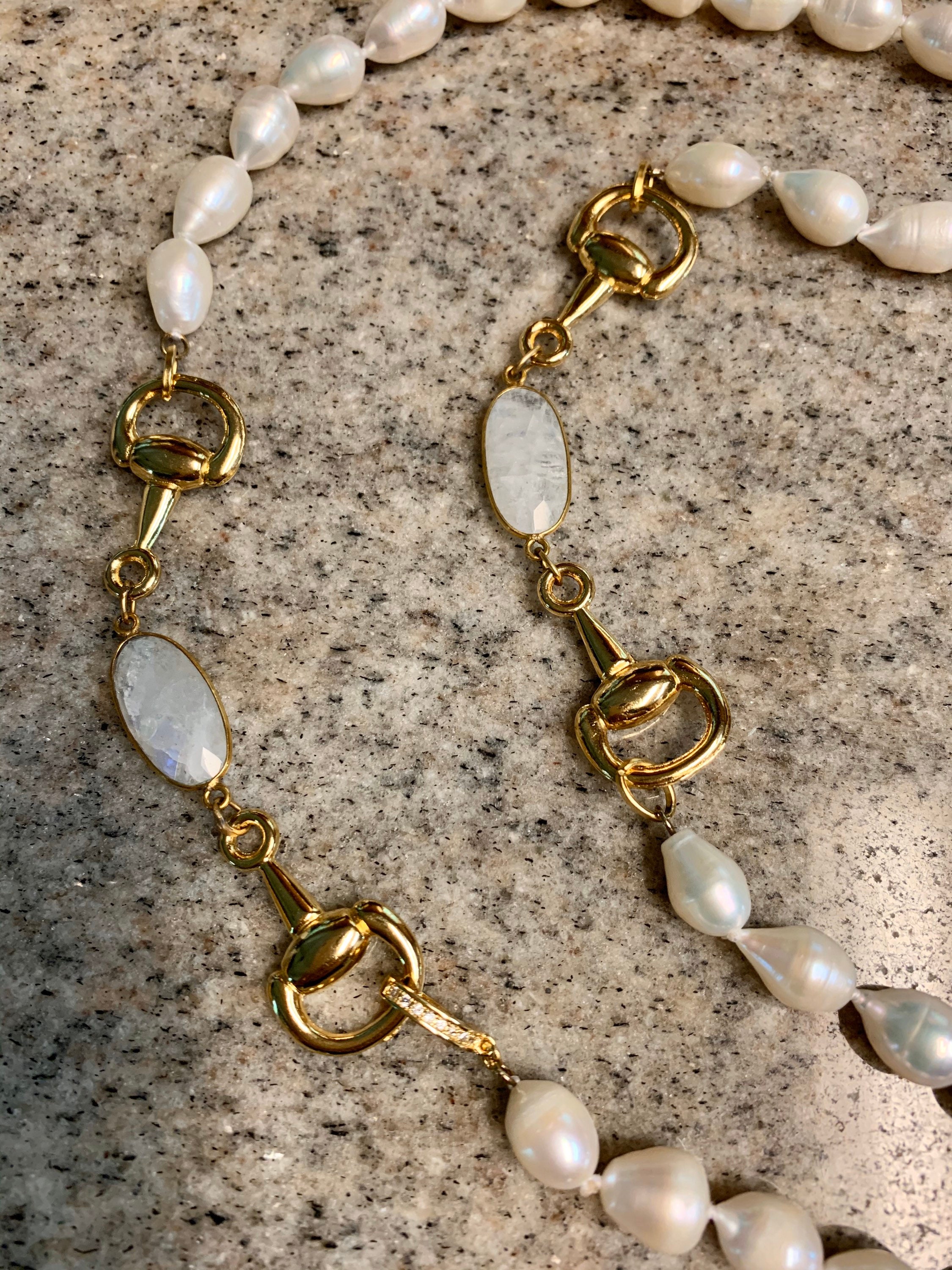 Long Teardrop Pearl & Moonstone Necklace, Pave Clasp, Versatil Double Wrap Necklace.
