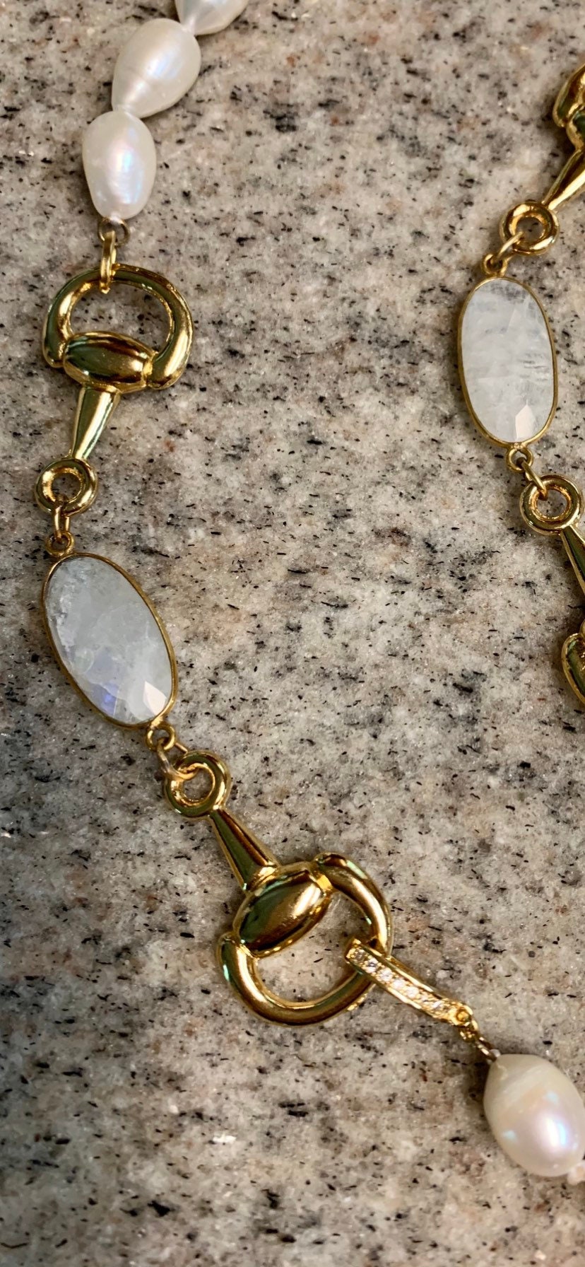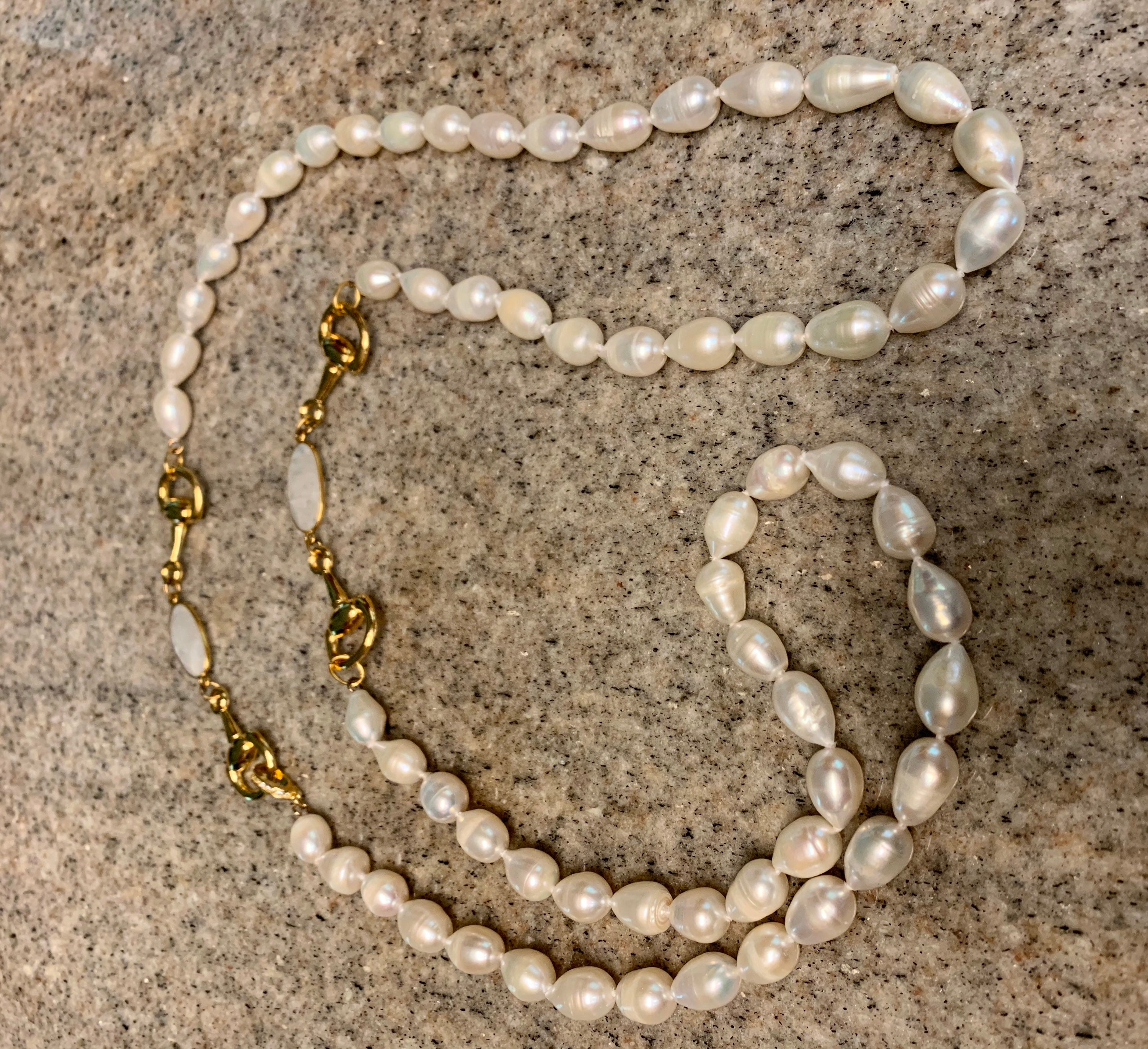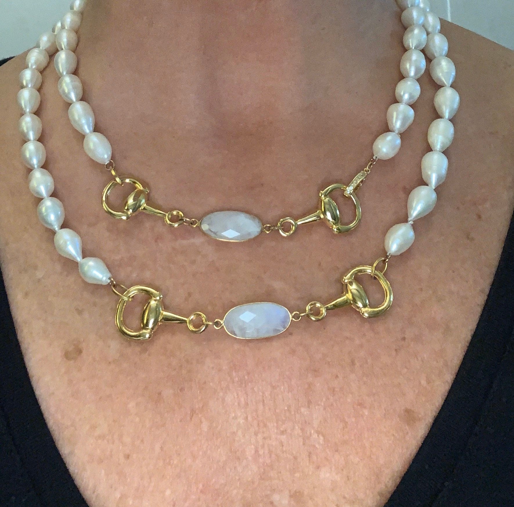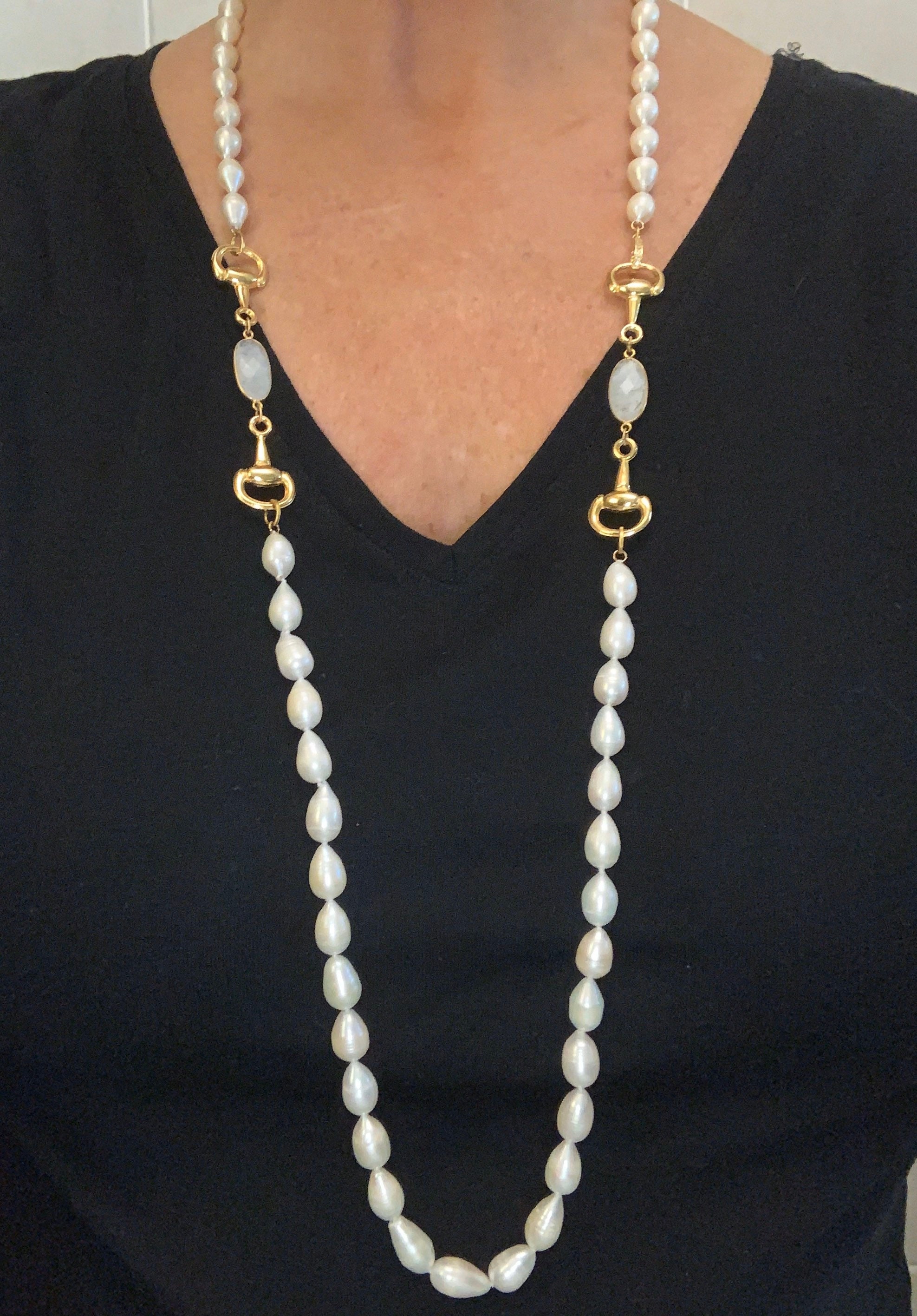 Long Teardrop Pearl & Moonstone Necklace, Pave Clasp, Versatil Double Wrap Necklace.